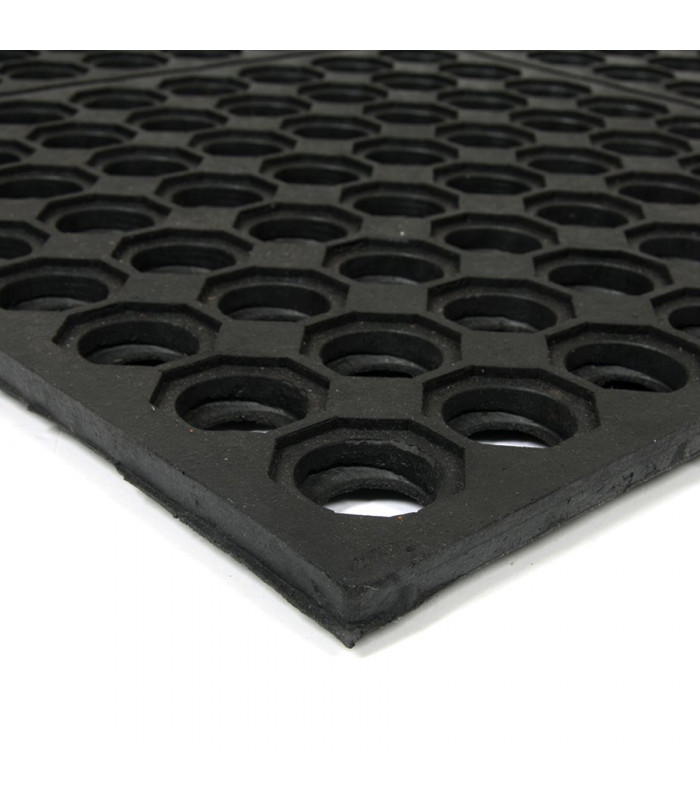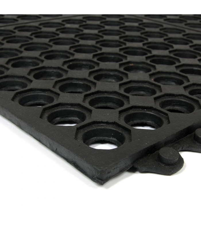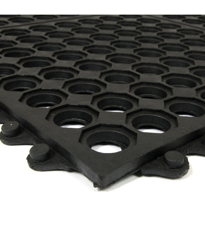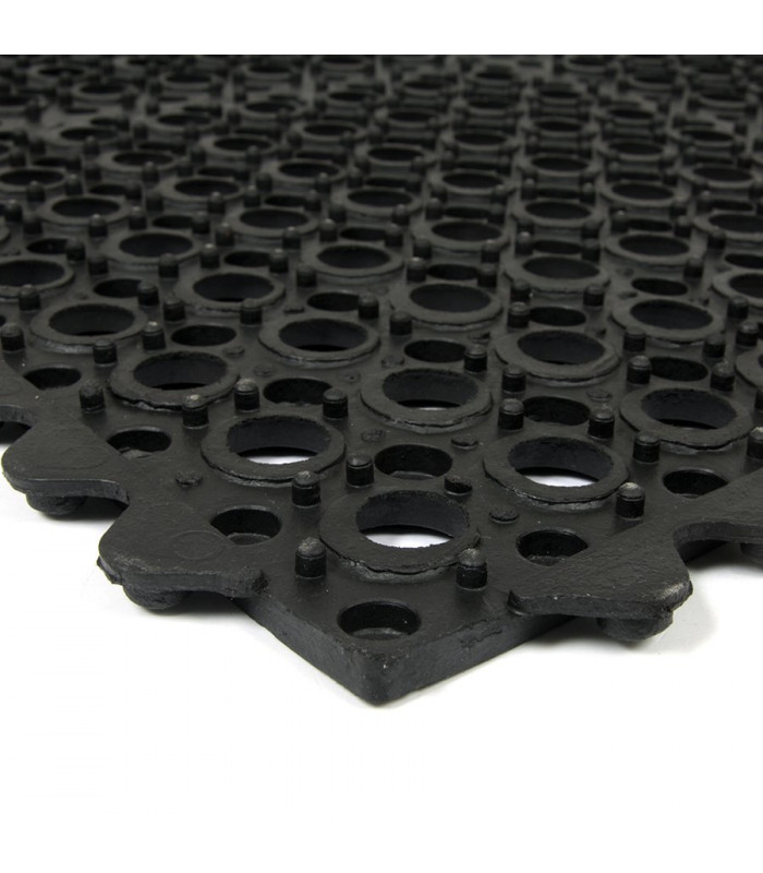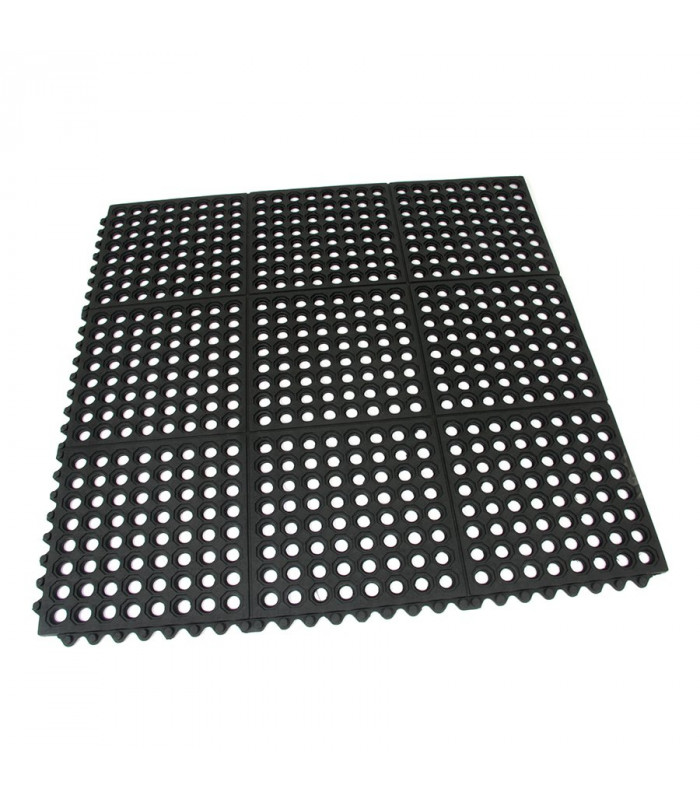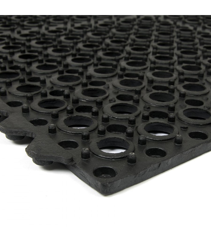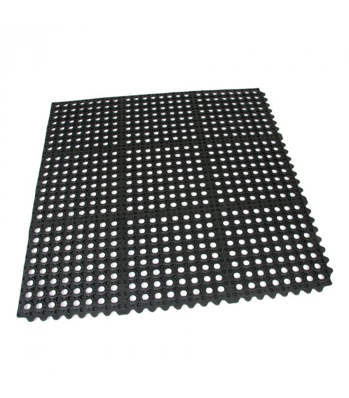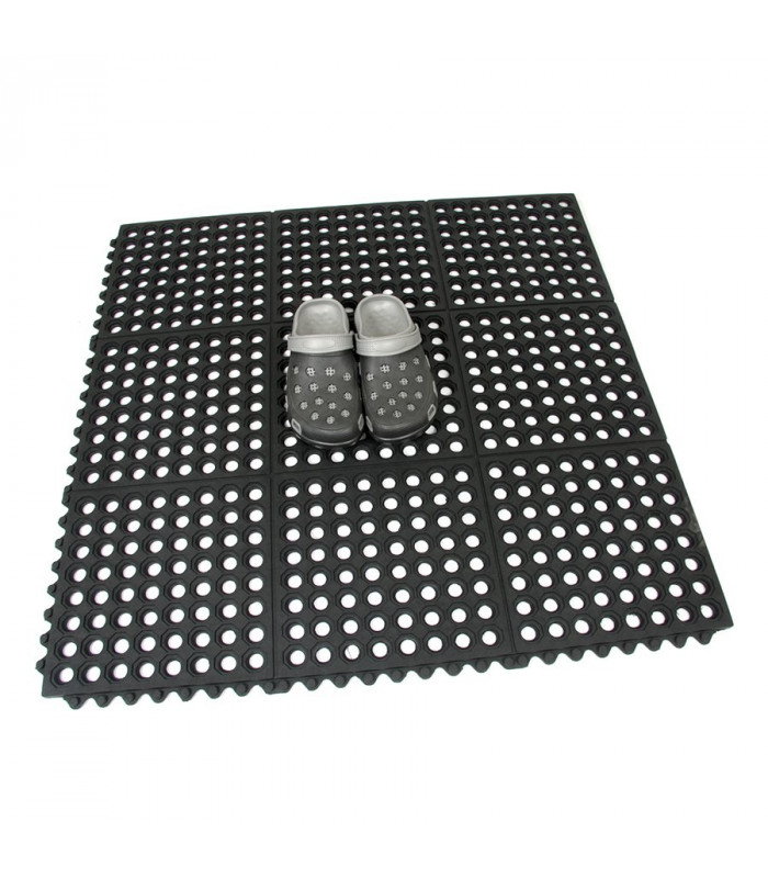 Modulární gumová rohož s otvory pro odvod kapalin a vody. Protiúnavová a protiskluzová funkce i v místech s kluzkým a mokrým povrchem.